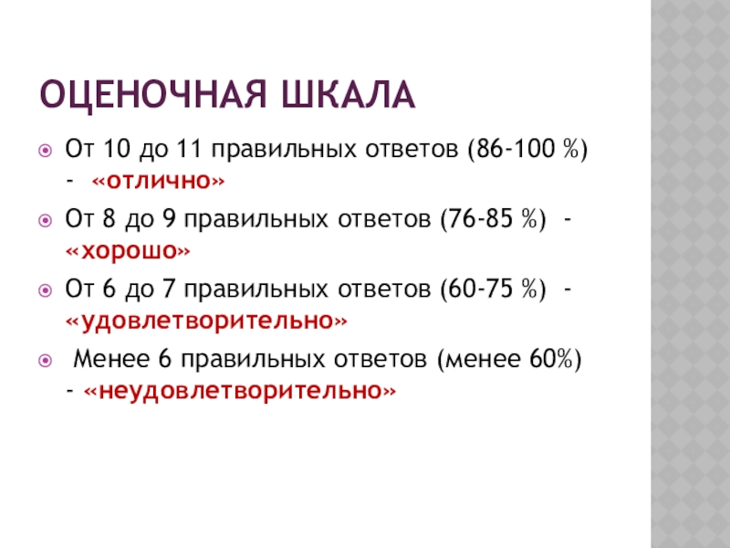 Оценочная шкалаОт 10 до 11 правильных ответов (86-100 %) - «отлично»От 8 до 9 правильных ответов (76-85