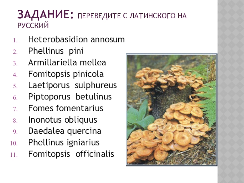 Задание: переведите с латинского на русскийHeterobasidion annosumPhellinus piniArmillariella melleaFomitopsis pinicolaLaetiporus sulphureusPiptoporus betulinus Fomes fomentariusInonotus obliquusDaedalea quercinaPhellinus igniarius