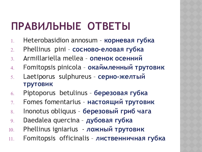 Правильные ответыHeterobasidion annosum – корневая губкаPhellinus pini – сосново-еловая губкаArmillariella mellea – опенок осеннийFomitopsis pinicola – окаймленный