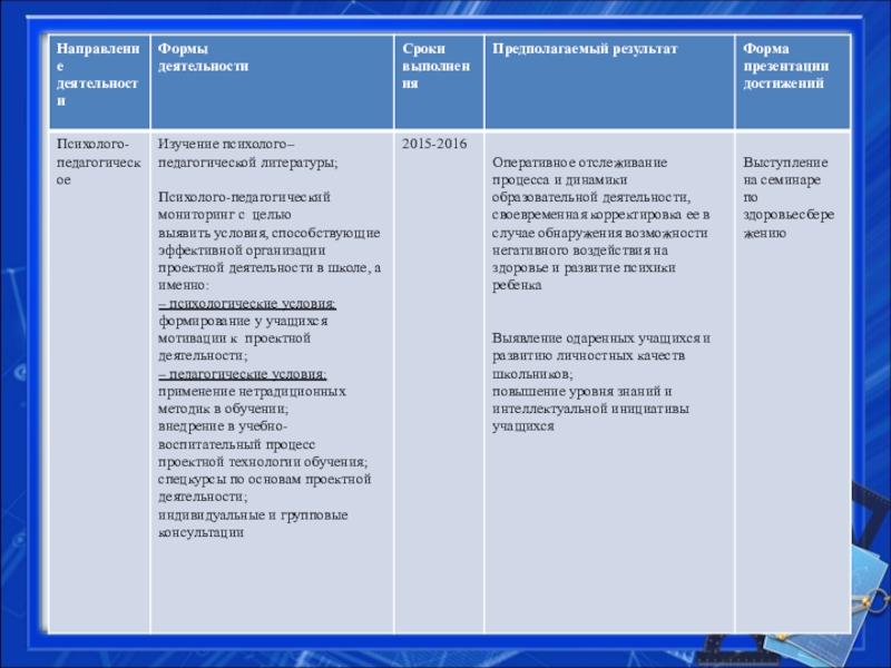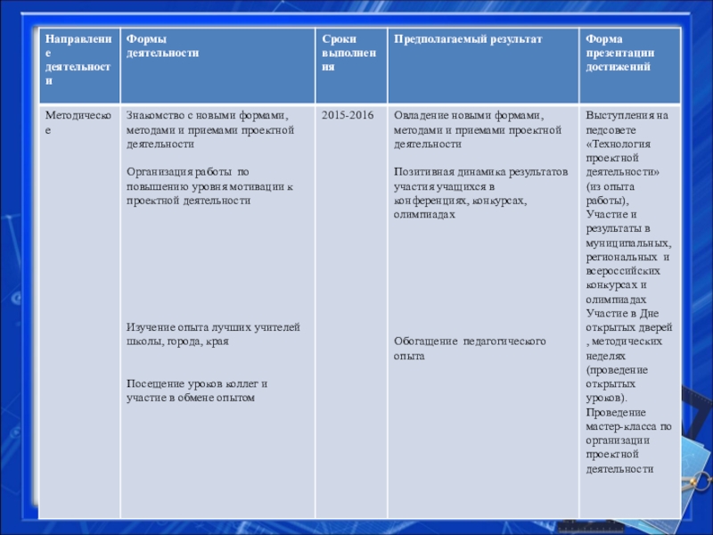 использование технологии проектной деятельности с целью формирования УУД, академических знаний, умений, навыков;