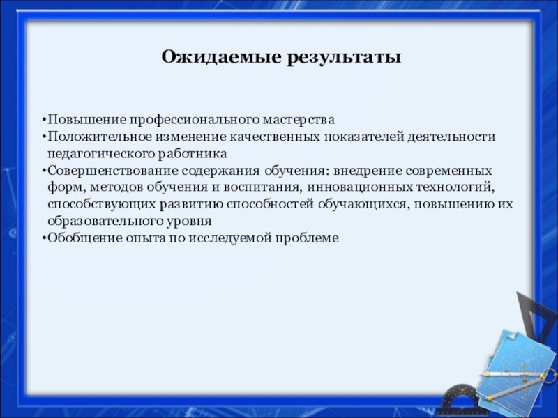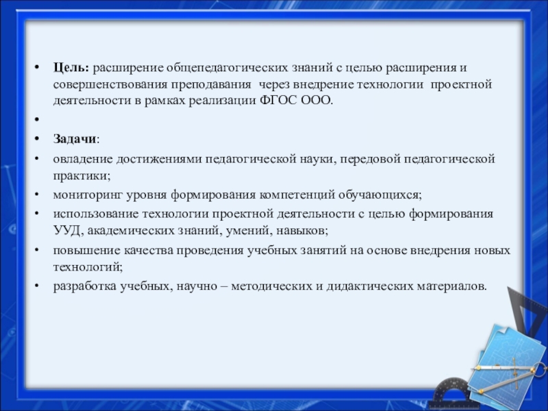Цель: расширение общепедагогических знаний с целью расширения и совершенствования преподавания через внедрение