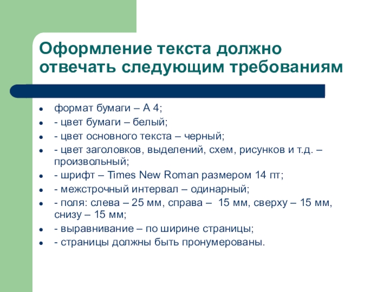 Слайд 14Оформление текста должно отвечать следующим требованиям