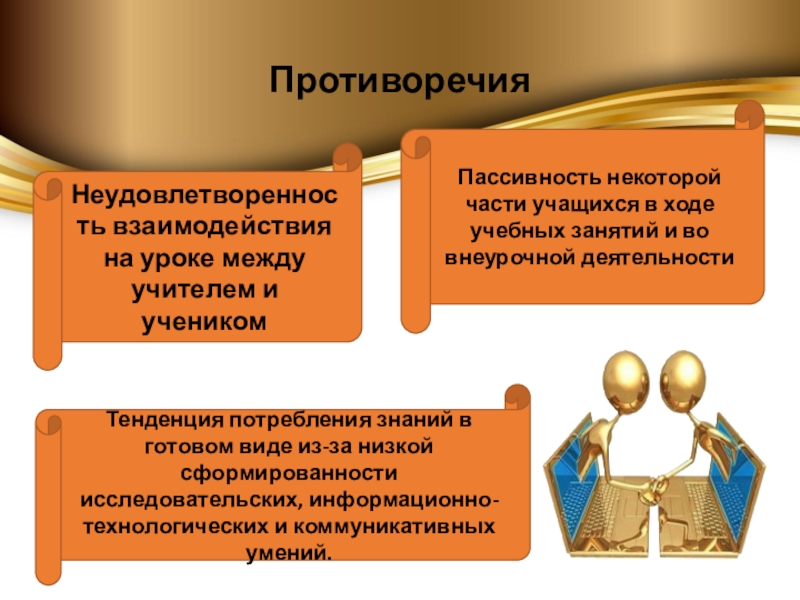 Тенденция потребления знаний в готовом виде из-за низкой сформированности исследовательских, информационно-технологических и коммуникативных умений.