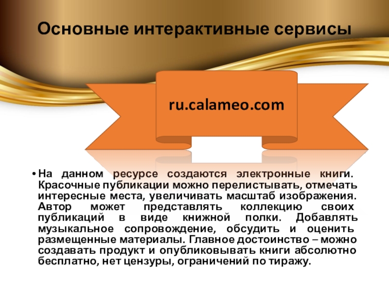 Это сайт презентаций, где можно хранить и обмениваться своими презентациями, докладами, проектами, шаблонами в формате PowerPoint с другими пользователями. Мы помогаем школьникам, студентам, учителям, преподавателям хранить и обмениваться учебными материалами.