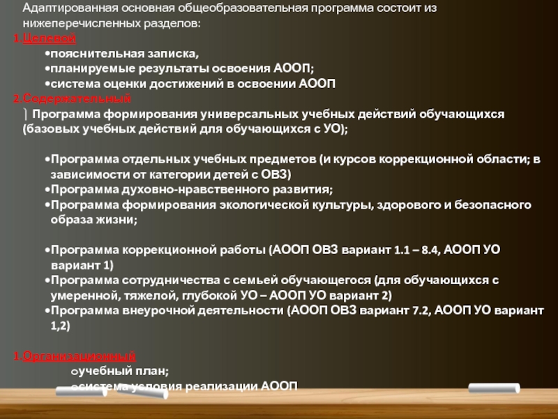 Слайд 15Адаптированная основная общеобразовательная программа состоит из нижеперечисленных разделов: