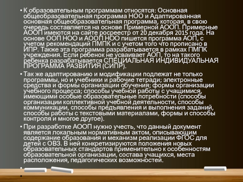 общеобразовательная программа, которая, в свою очередь составляется на основе Примерной АООП. Примерные АООП имеются на сайте росреестр от 20 декабря 2015 года. На основе ООП НОО и АООП НОО пишется программа АОП, с учетом рекомендаций ПМПК и с учетом того что прописано в ИПР. Также эта программа разрабатывается в рамках ПМПК учреждения. Если ребенок не усваивает АОП, то на такого ребенка разрабатывается СПЕЦИАЛЬНАЯ ИНДИВИДУАЛЬНАЯ ПРОГРАММА РАЗВИТИЯ (СИПР).