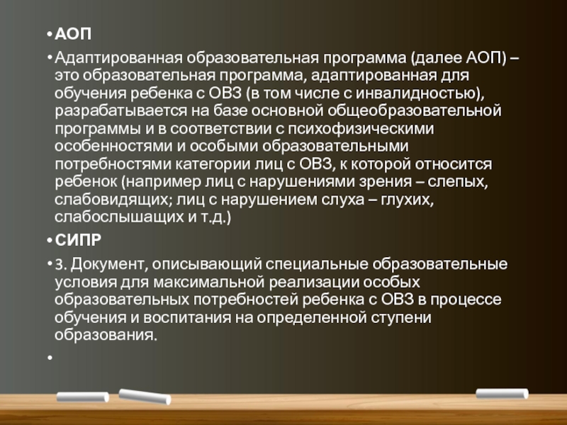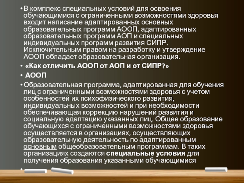 входит написание адаптированных основных образовательных программ АООП, адаптированных образовательных программ АОП и специальных индивидуальных программ развития СИПР.Исключительным правом на разработку и утверждение АООП обладает образовательная организация.