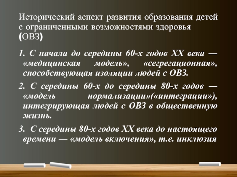 начала до середины 60-х годов ХХ века ― «медицинская модель», «сегрегационная», способствующая изоляции людей с ОВЗ.