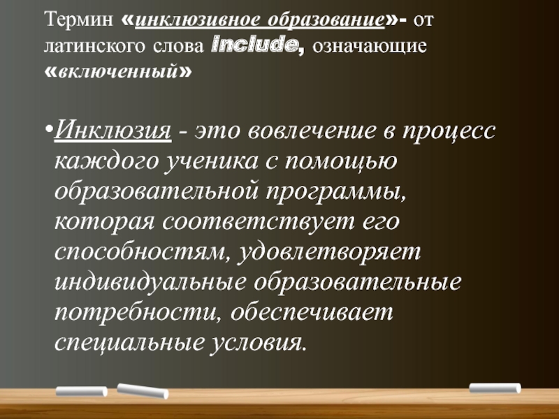 Слайд 4Термин «инклюзивное образование»- от латинского слова include, означающие «включенный»