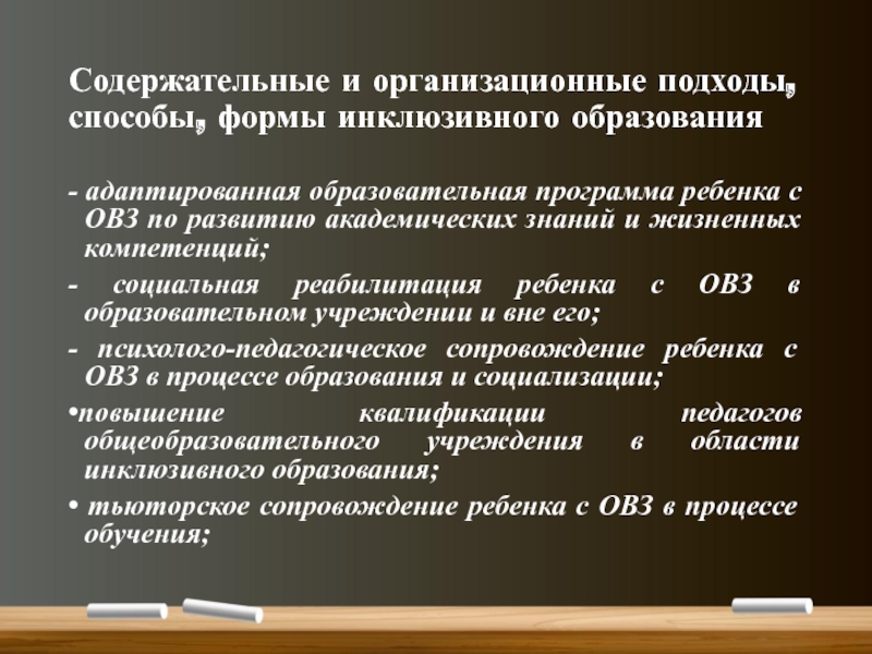 Слайд 10Содержательные и организационные подходы, способы, формы инклюзивного образования