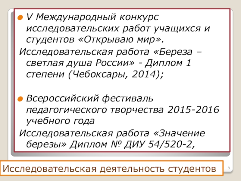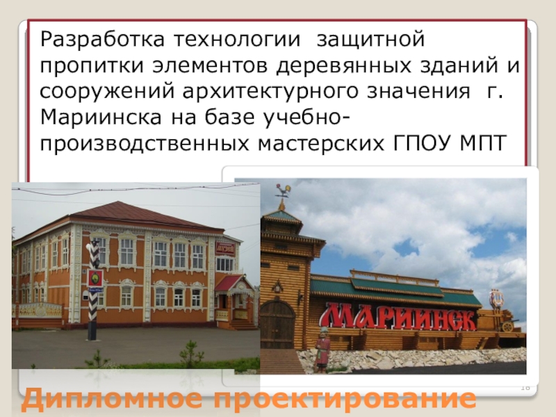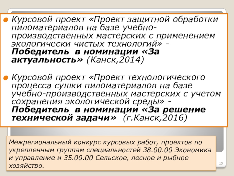 Курсовой проект «Проект защитной обработки пиломатериалов на базе учебно-производственных мастерских с применением экологически чистых технологий» - Победитель в номинации «За актуальность» (Канск,2014)