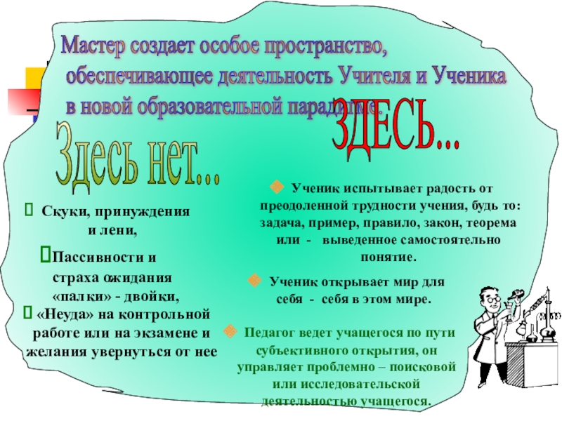 Педагог ведет учащегося по пути субъективного открытия, он управляет проблемно – поисковой или исследовательской деятельностью учащегося.