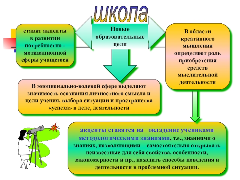 акценты ставятся на овладение учениками методологическими знаниями, т.е., знаниями о знаниях, позволяющими самостоятельно открывать неизвестные для себя свойства, особенности, закономерности и пр., находить способы поведения и деятельности в проблемной ситуации.