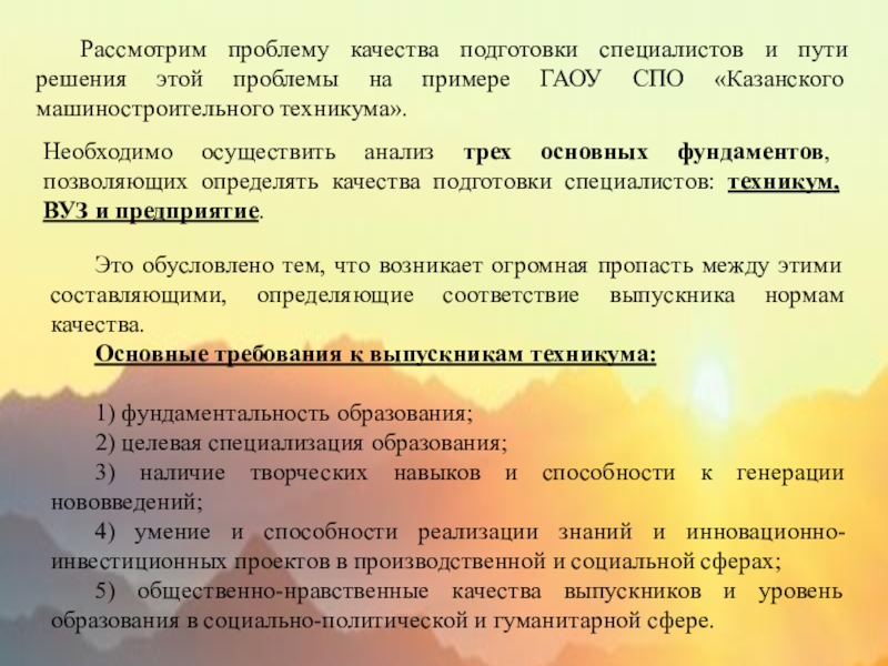 Необходимо осуществить анализ трех основных фундаментов, позволяющих определять качества подготовки специалистов: техникум, ВУЗ и предприятие.