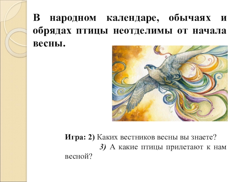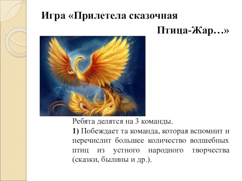 1) Побеждает та команда, которая вспомнит и перечислит большее количество волшебных птиц из устного народного творчества (сказки, былины и др.).