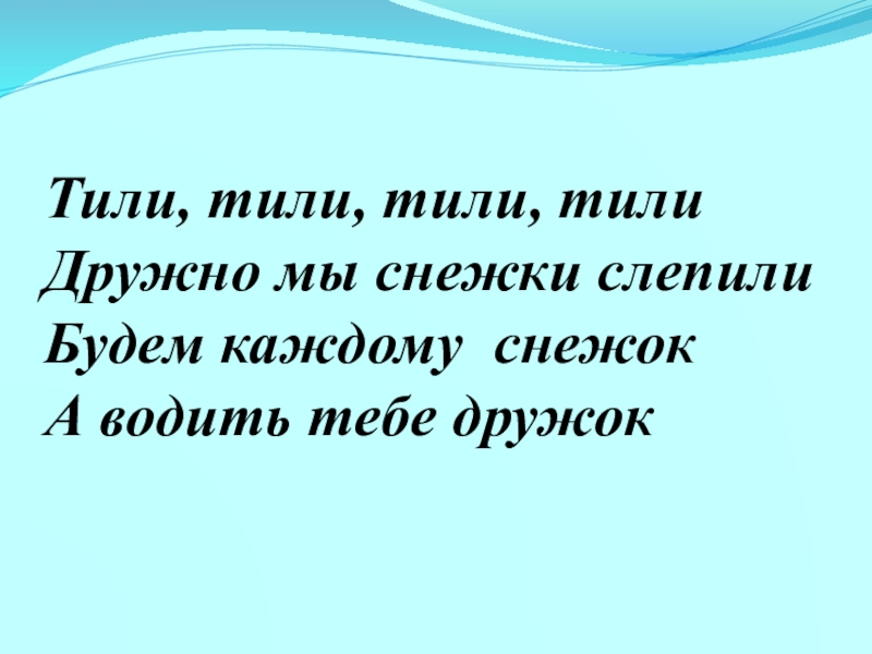 Слайд 5Тили, тили, тили, тили Дружно мы снежки слепили Будем каждому снежок А водить тебе