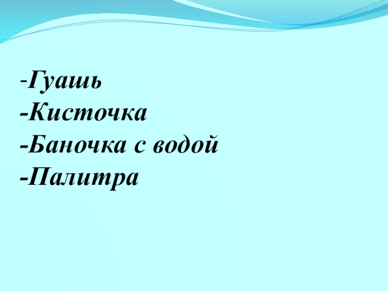 Слайд 3-Гуашь -Кисточка -Баночка с водой -Палитра