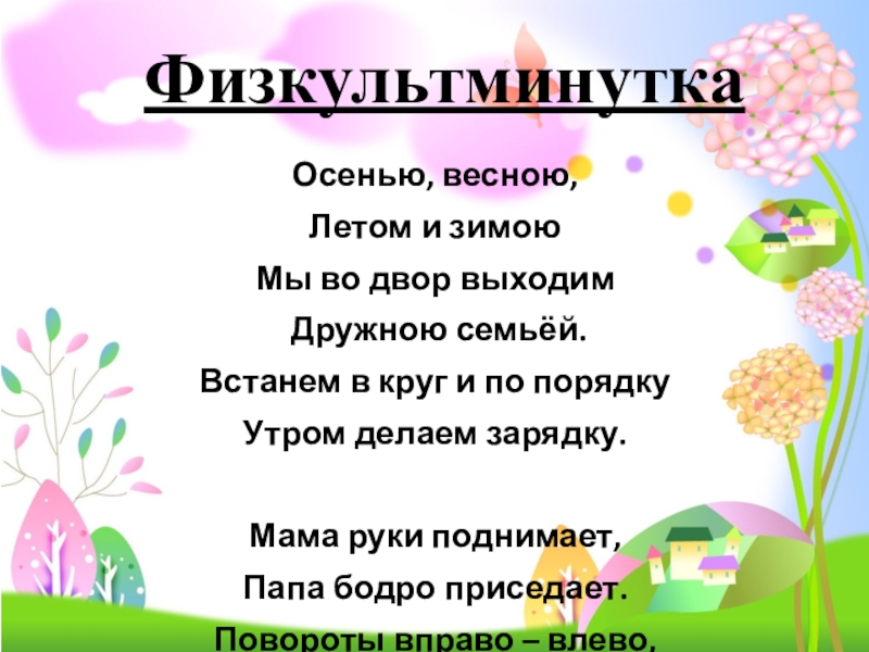 ФизкультминуткаОсенью, весною,Летом и зимоюМы во двор выходим Дружною семьёй.Встанем в круг и по порядку Утром делаем зарядку.Мама
