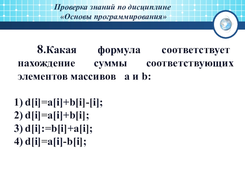 8. Какая формула соответствует нахождение суммы соответствующих элементов массивов a и b: