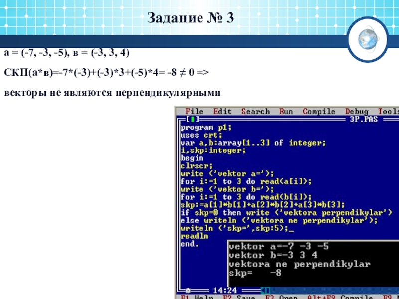 в = (-3; 3; 4). В случае перпендикулярности вывести сообщение «Вектора перпендикулярны», в противном случае «Вектора не перпендикулярны».
