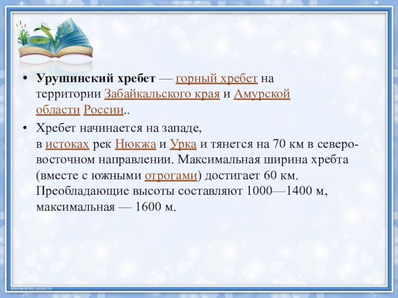 Слайд 8Урушинский хребет — горный хребет на территории Забайкальского края и Амурской области России..