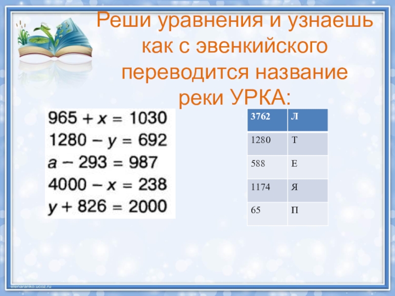Слайд 7Реши уравнения и узнаешь как с эвенкийского переводится название реки УРКА: