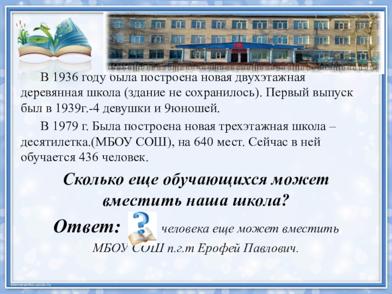 Слайд 19 В 1936 году была построена новая двухэтажная деревянная школа (здание не