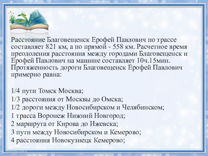Слайд 3Расстояние Благовещенск Ерофей Павлович по трассе составляет 821 км, а по