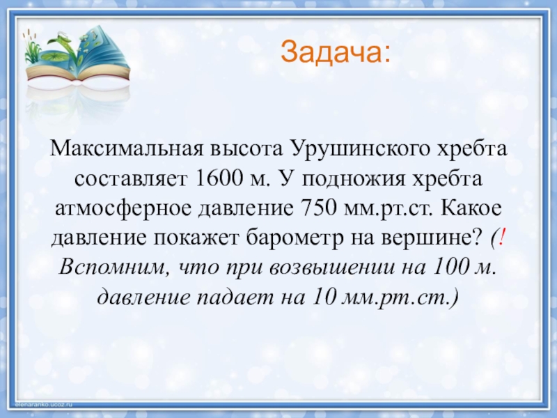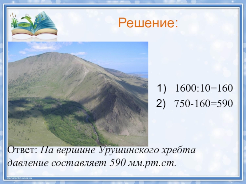 Ответ: На вершине Урушинского хребта давление составляет 590 мм.рт.ст.