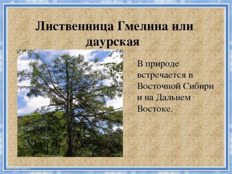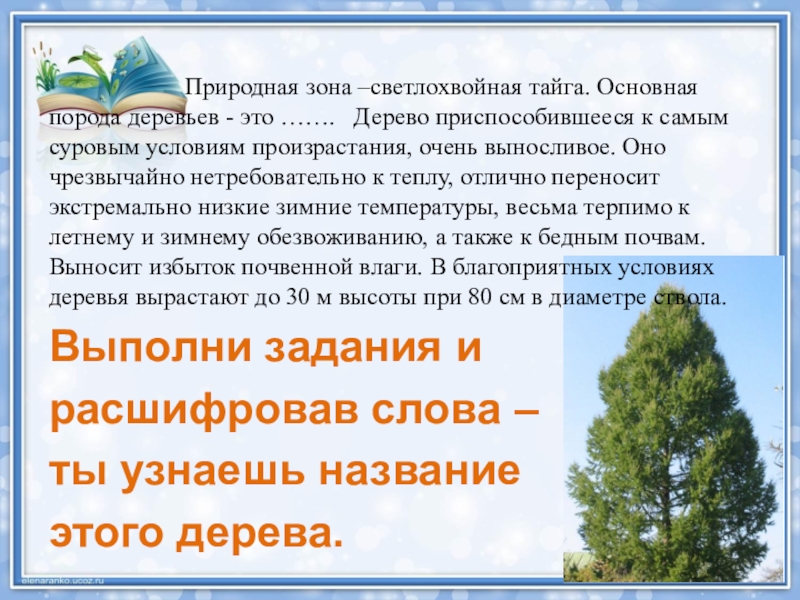 Природная зона –светлохвойная тайга. Основная порода деревьев - это ……. Дерево приспособившееся к самым суровым условиям произрастания, очень выносливое. Оно чрезвычайно нетребовательно к теплу, отлично переносит экстремально низкие зимние температуры, весьма терпимо к летнему и зимнему обезвоживанию, а также к бедным почвам. Выносит избыток почвенной влаги. В благоприятных условиях деревья вырастают до 30 м высоты при 80 см в диаметре ствола.