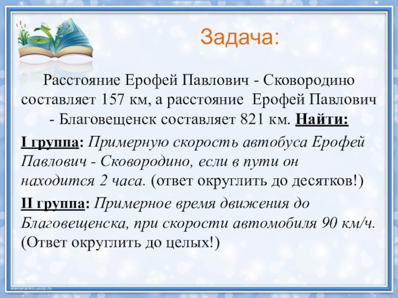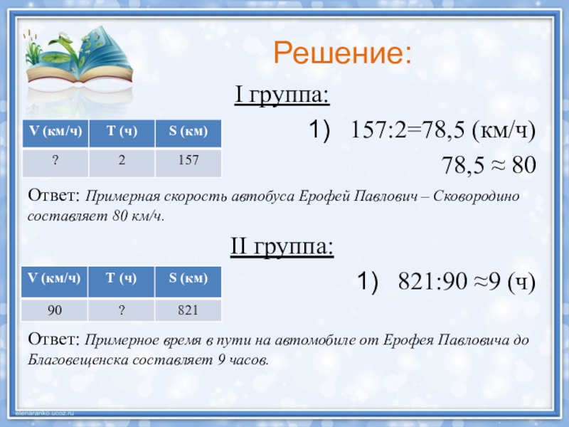 I группа: Примерную скорость автобуса Ерофей Павлович - Сковородино, если в пути он находится 2 часа. (ответ округлить до десятков!)