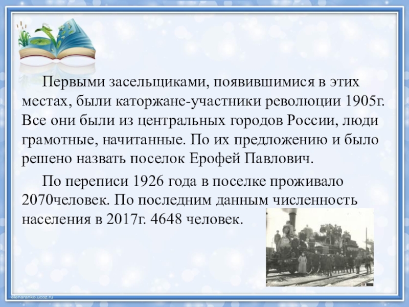 они были из центральных городов России, люди грамотные, начитанные. По их предложению и было решено назвать поселок Ерофей Павлович.