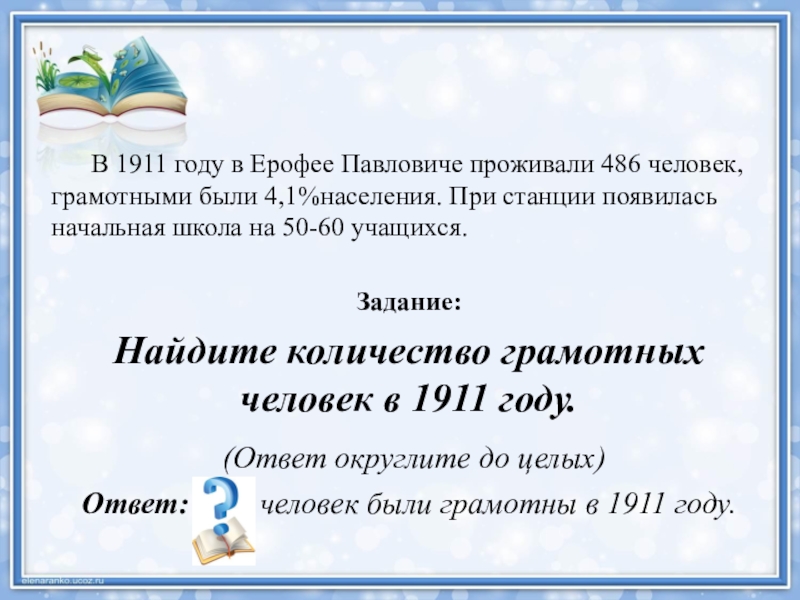 Слайд 18 В 1911 году в Ерофее Павловиче проживали 486 человек, грамотными были