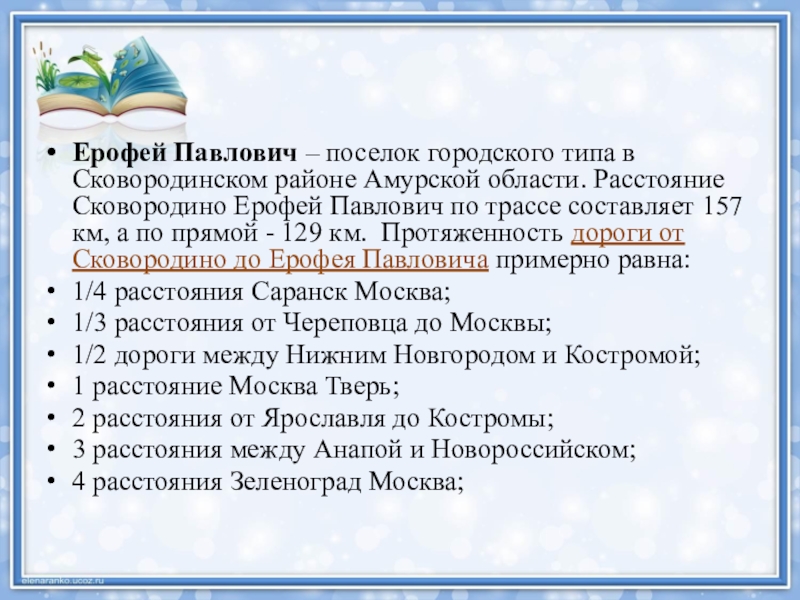 Слайд 2Ерофей Павлович – поселок городского типа в Сковородинском районе Амурской области. Расстояние