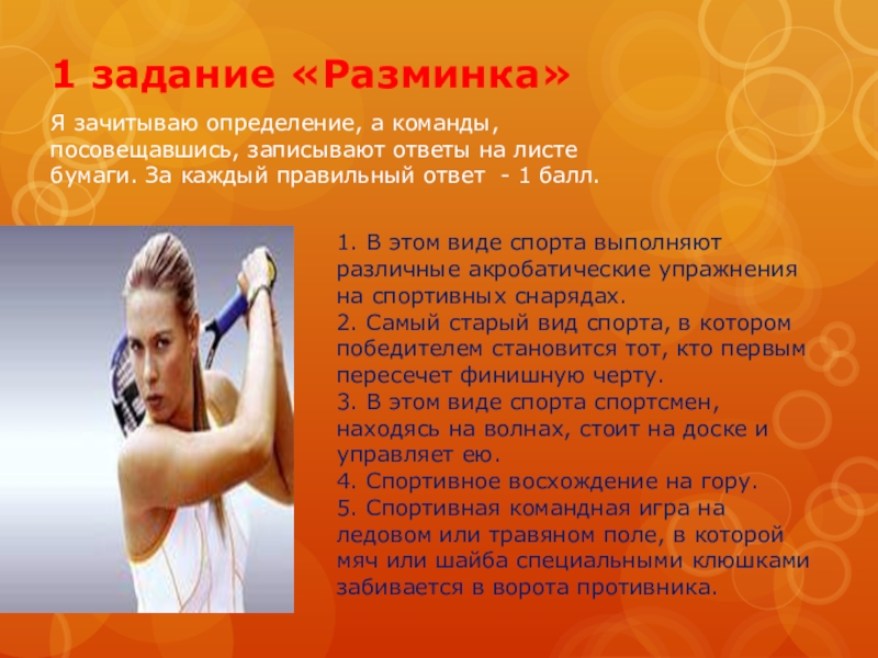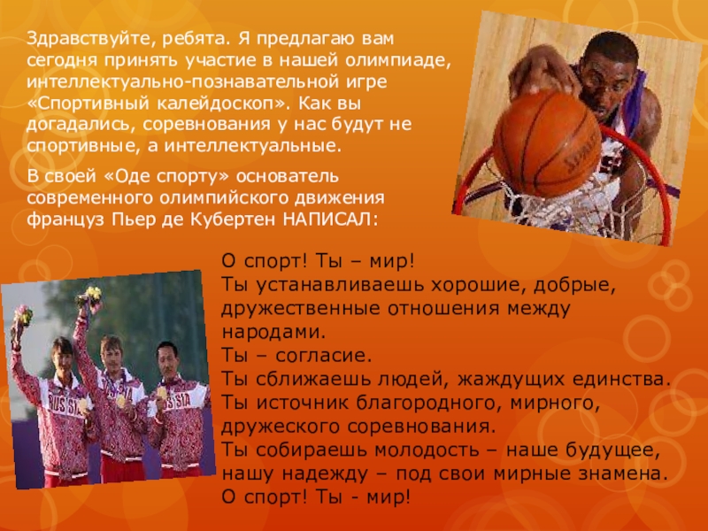 Здравствуйте, ребята. Я предлагаю вам сегодня принять участие в нашей олимпиаде, интеллектуально-познавательной игре «Спортивный калейдоскоп». Как вы догадались, соревнования у нас будут не спортивные, а интеллектуальные.