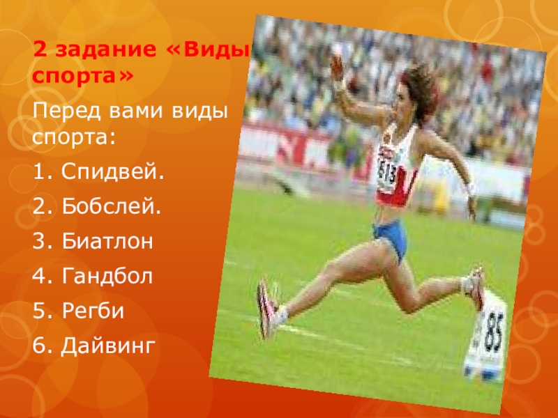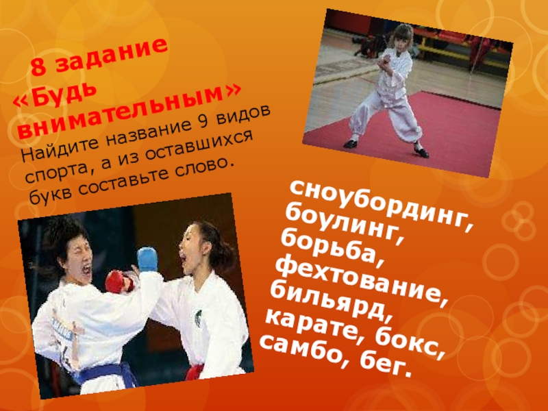 сноубординг, боулинг, борьба, фехтование, бильярд, карате, бокс, самбо, бег.