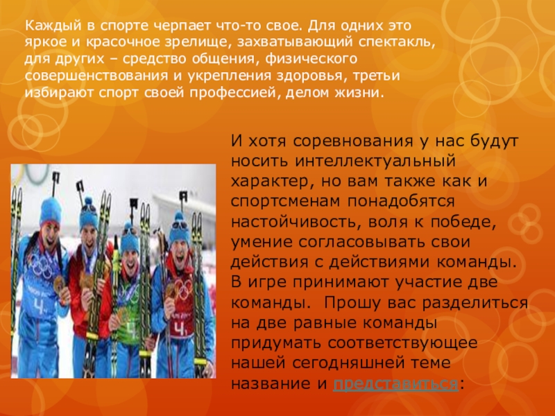 Каждый в спорте черпает что-то свое. Для одних это яркое и красочное зрелище, захватывающий спектакль, для других – средство общения, физического совершенствования и укрепления здоровья, третьи избирают спорт своей профессией, делом жизни.