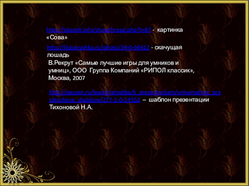 http://easyen.ru/load/metodika/k_prezentacijam/universalnye_prazdnichnye_shablony/277-1-0-14552 – шаблон презентации Тихоновой Н.А.