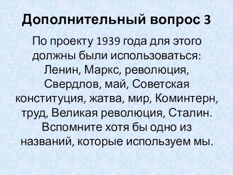 Ленин, Маркс, революция, Свердлов, май, Советская конституция, жатва, мир, Коминтерн, труд, Великая революция, Сталин. Вспомните хотя бы одно из названий, которые используем мы.