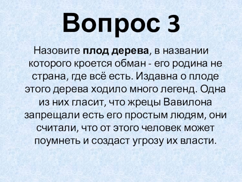 родина не страна, где всё есть. Издавна о плоде этого дерева ходило много легенд. Одна из них гласит, что жрецы Вавилона запрещали есть его простым людям, они считали, что от этого человек может поумнеть и создаст угрозу их власти.