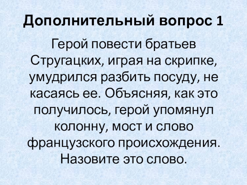 посуду, не касаясь ее. Объясняя, как это получилось, герой упомянул колонну, мост и слово французского происхождения. Назовите это слово.