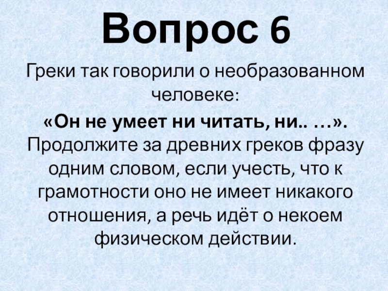 читать, ни.. …». Продолжите за древних греков фразу одним словом, если учесть, что к грамотности оно не имеет никакого отношения, а речь идёт о некоем физическом действии.