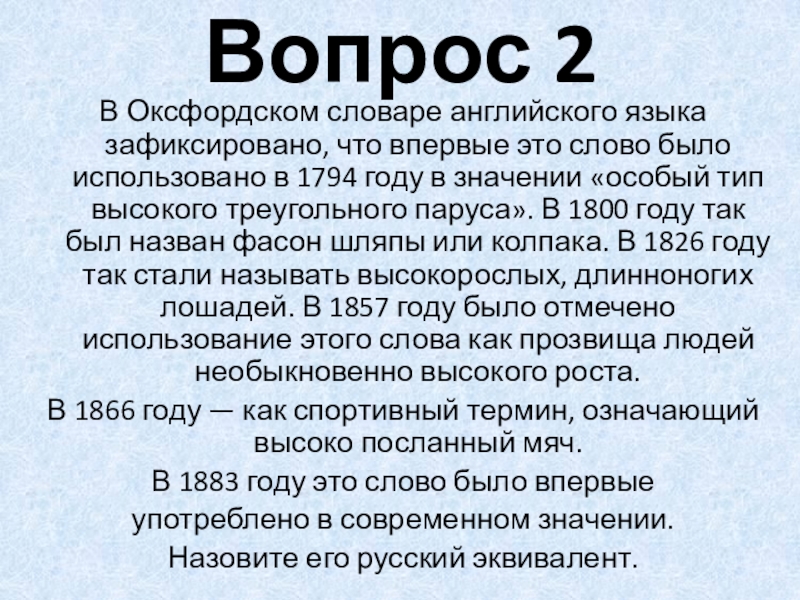 В 1866 году — как спортивный термин, означающий высоко посланный мяч.