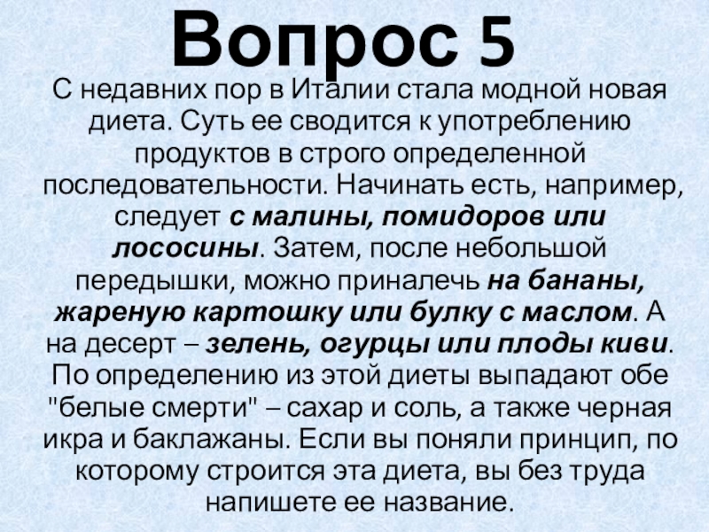ее сводится к употреблению продуктов в строго определенной последовательности. Начинать есть, например, следует с малины, помидоров или лососины. Затем, после небольшой передышки, можно приналечь на бананы, жареную картошку или булку с маслом. А на десерт – зелень, огурцы или плоды киви. По определению из этой диеты выпадают обе "белые смерти" – сахар и соль, а также черная икра и баклажаны. Если вы поняли принцип, по которому строится эта диета, вы без труда напишете ее название.