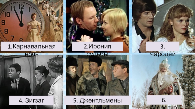 1.Карнавальная ночь2.Ирония судьбы3. Чародеи4. Зигзаг удачи5. Джентльмены удачи6. Морозко