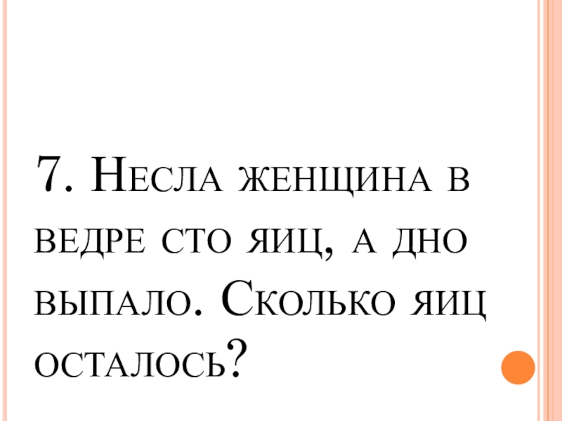 Слайд 97. Несла женщина в ведре сто яиц, а дно выпало. Сколько