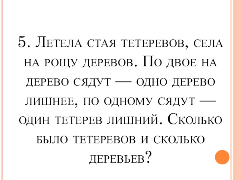дерево сядут — одно дерево лишнее, по одному сядут — один тетерев лишний. Сколько было тетеревов и сколько деревьев?