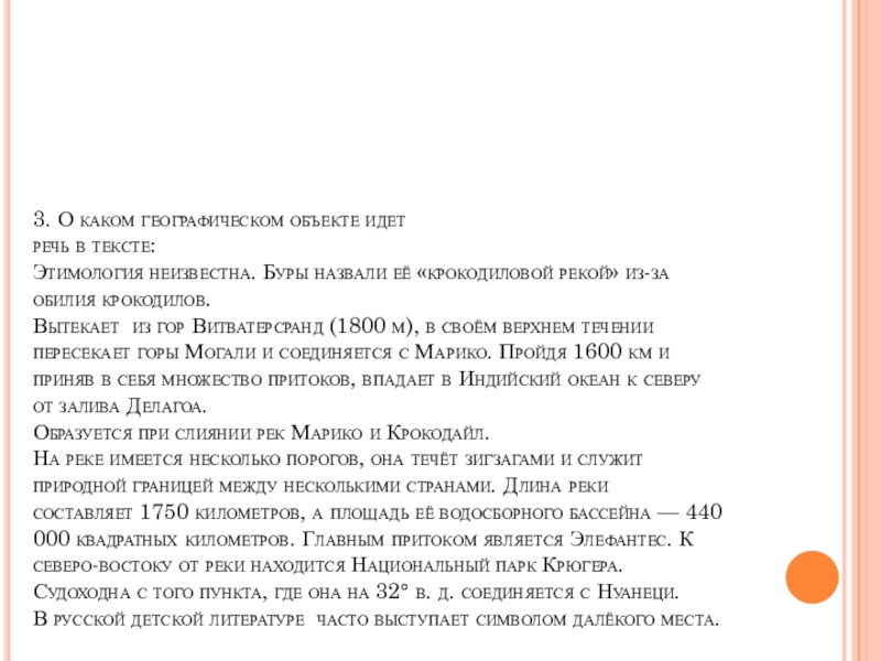 Вытекает из гор Витватерсранд (1800 м), в своём верхнем течении