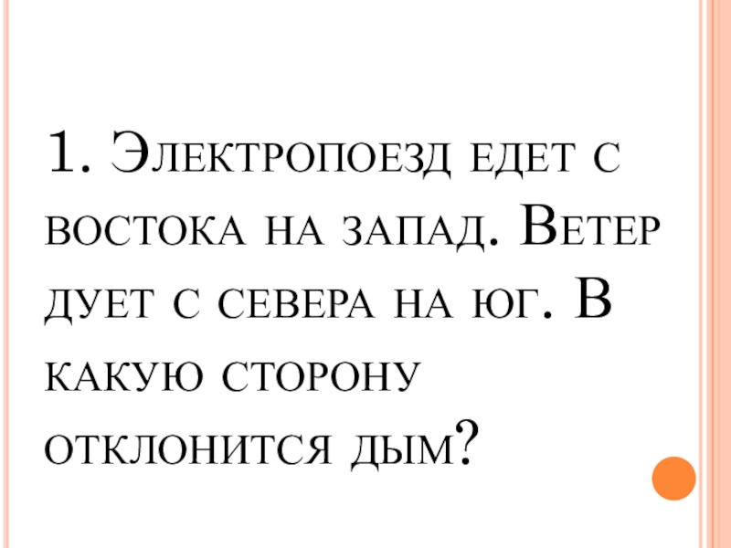 Слайд 111. Электропоезд едет с востока на запад. Ветер дует с севера