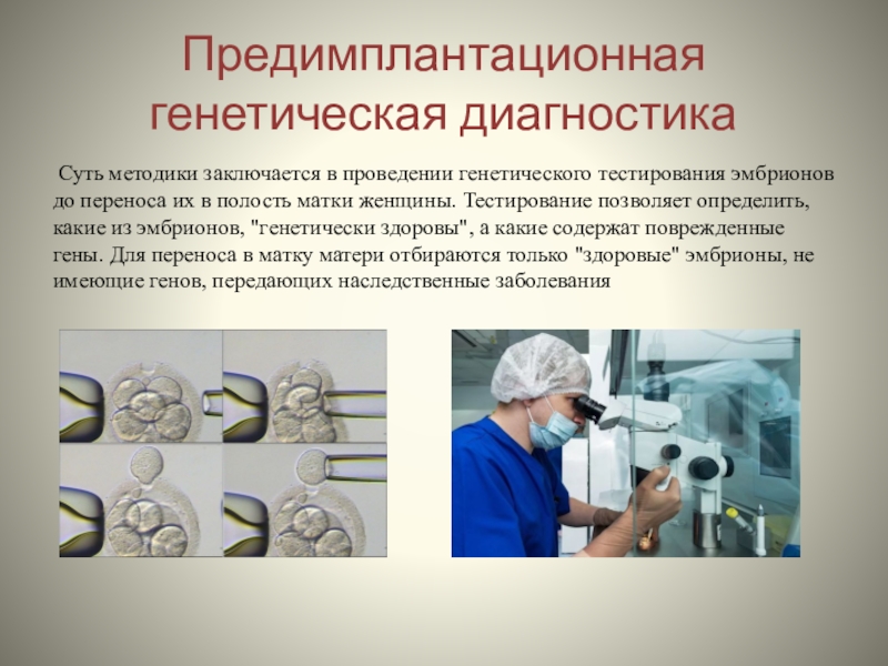 эмбрионов до переноса их в полость матки женщины. Тестирование позволяет определить, какие из эмбрионов, "генетически здоровы", а какие содержат поврежденные гены. Для переноса в матку матери отбираются только "здоровые" эмбрионы, не имеющие генов, передающих наследственные заболевания